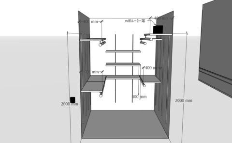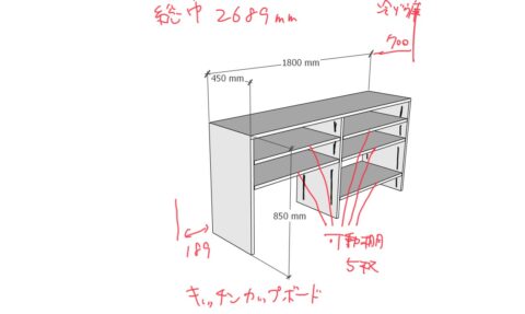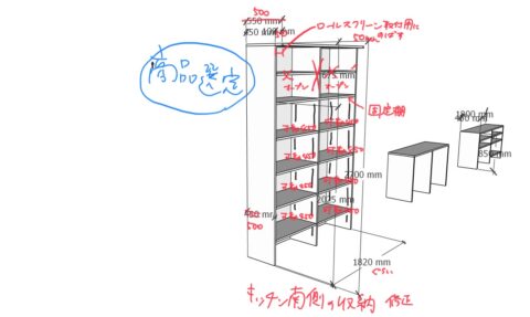 キッチン背面収納やウォークインクローゼットの収納棚について、SketchUpモデルに手書きで修正を加えながら、棚の高さや奥行き、可動棚の枚数など細かい寸法をひとつずつ決定していきました。