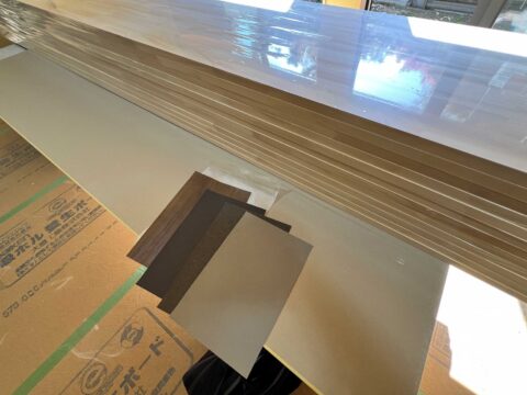 写真の大きな板は、これから製作する造作(ぞうさく)家具の材料です。