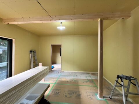 大工さんによる内装工事が順調に進んでおり、壁と天井の石膏ボード貼りが完了しました。